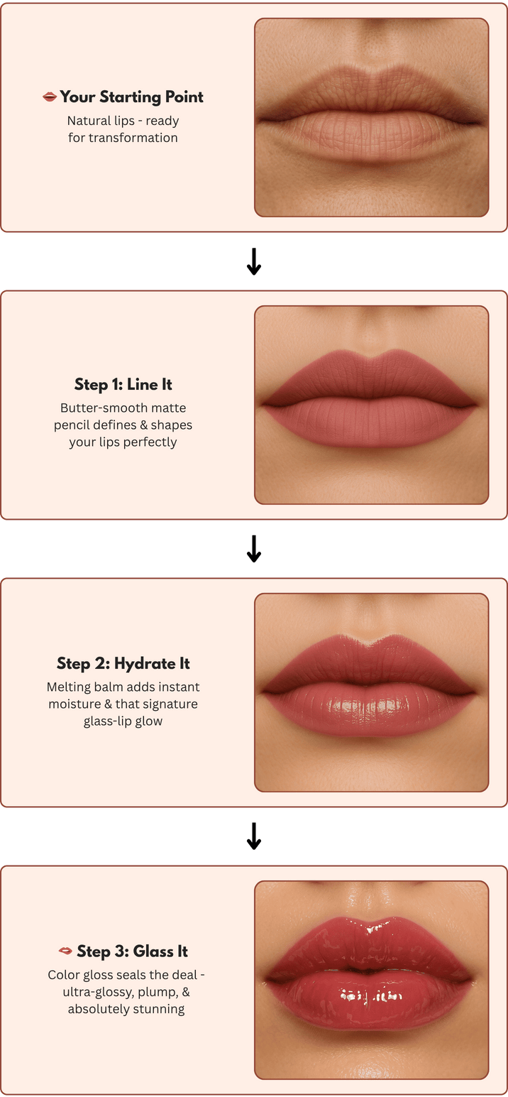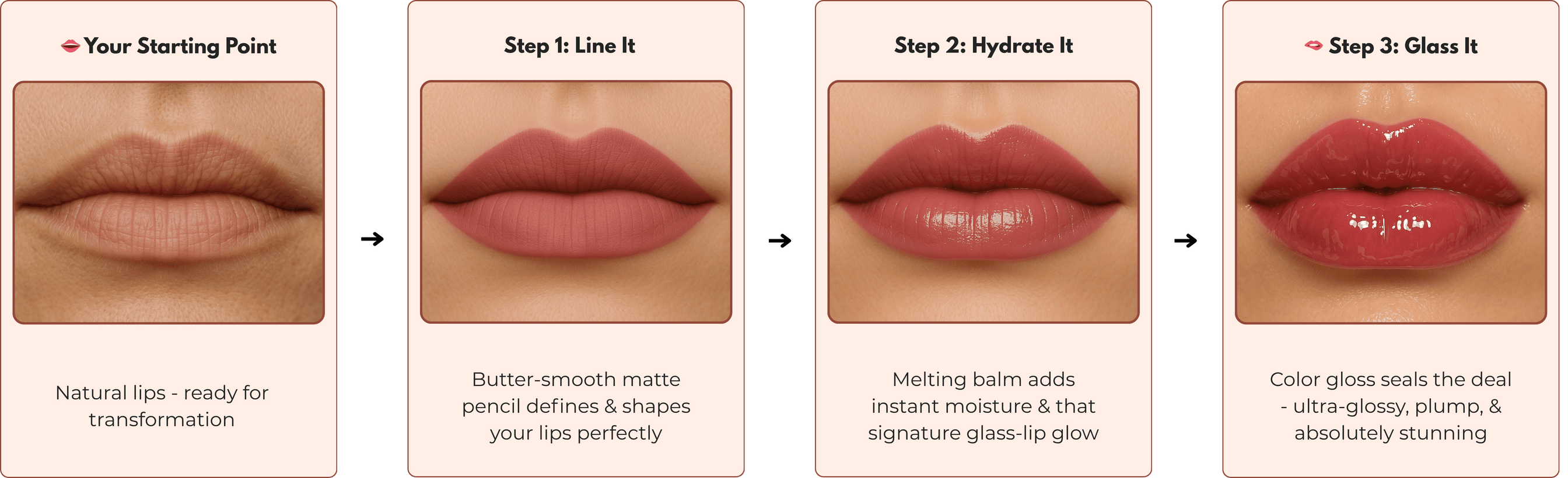 The revolutionary 3-step lip kit that melts, sculpts & shines for instant glass-like volume.No fillers, no filters, no stickiness — just buttery, plump lips in seconds.